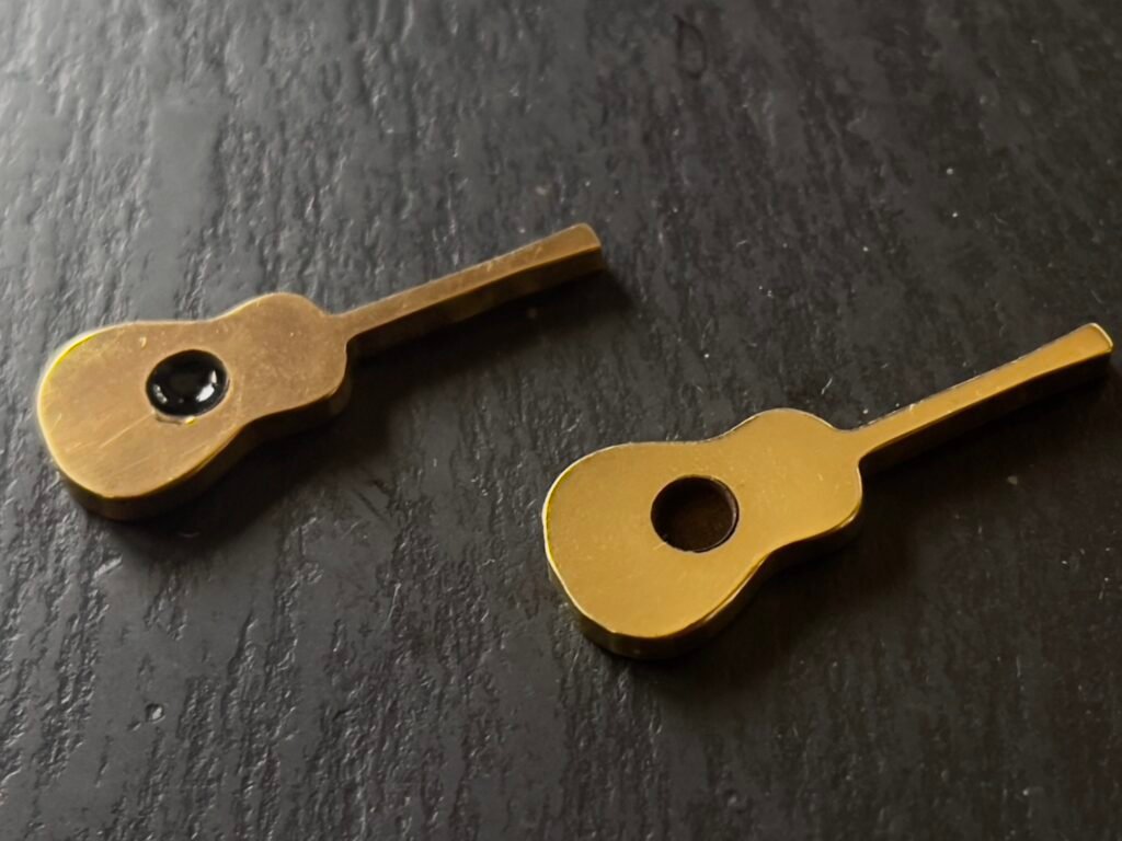 I do a little work on some prototype brass guitar pins. The first sound hole goes right through the brass so I fill it with black epoxy. The next one is more like I intend. I quite like both versions.