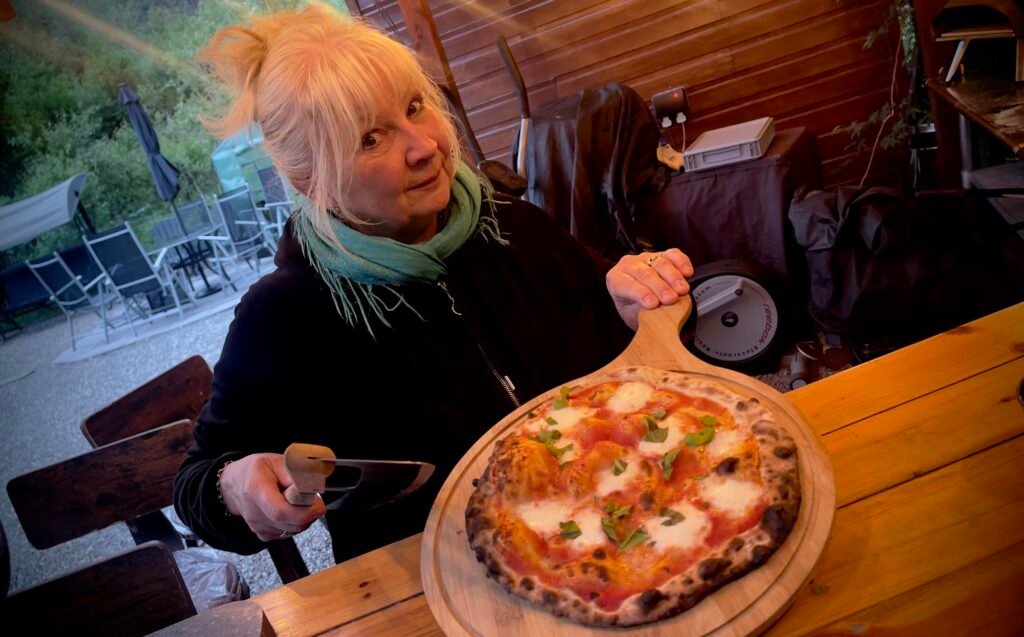 Later on we venture outside for pizza…I made another batch of Roman/thin-crust dough the other day – and a good three or four years since we got the Ooni, Margaret preps and cooks her first pizza. And it’s great 🙂