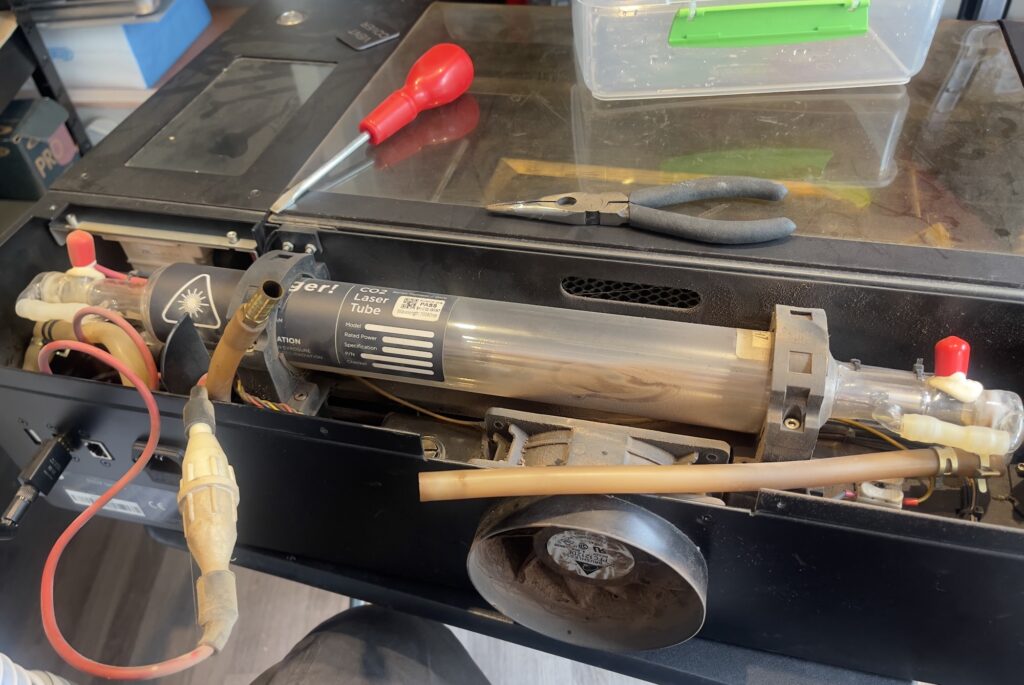 First job is to flush out the cooling system and laser tune on the CO2 laser. A time-consuming and fiddly job that’s probably a year overdue. Then I need to clan the mirrors and lens, clean everything out and oil the rails.